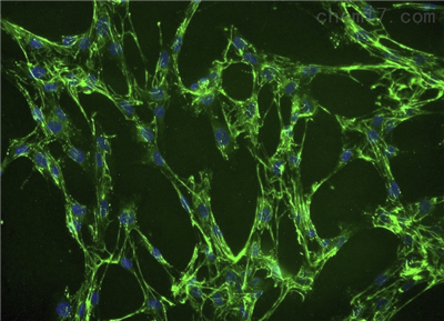 HVMF;人绒毛间充质成纤维细胞(原代细胞)其来源于胚胎中胚层。由于组织特异性间充质细胞是正常器官发育所必需的,因此绒毛间充质成纤维细胞(VMF)已被用作研究调节人胎盘生长的细胞机制的模型系统[1]。VMF直接位于绒毛基底膜下方; 他们合成HGF,CSF-1,粒细胞CSF和IL-6 [2],并在滋养细胞生长和功能的调节中发挥重要作用。研究表明,胎盘VMF与锚定位点细胞滋养层之间的旁分泌相互作用